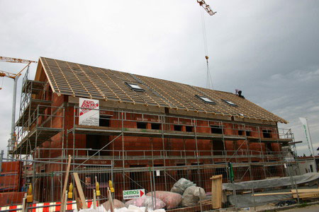 Dachstuhlmit drei Dachgaubenfür 3 Familienhaus.Dachstuhl aus Dachelementen, die werkseitig mit Wärmedämmung, Dach-flächenfenster bis hin zur Dachlattung komplett vorgefertigt und von uns innerhalb von einem Tag montiert wurden. |