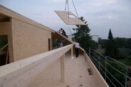 Dachstuhlaus MassivholzMagnum Board Dachelementmit Aussparung für Dachflächenfester. Dieses System bietet einen extrem guten sommerlichen Wärmeschutz durch einen sehr hohen Phasenverschiebungs-wert. Dachuntersichten für sofortige Malerarbeiten vorbereitet. Dachaufbau im Detail (siehe Massivholzbau) |